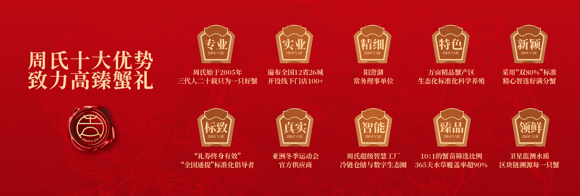 周氏水產(chǎn)精品大閘蟹,14年匠心沉淀,全國(guó)87家直營(yíng)門店,100只大閘蟹只精選最優(yōu)50只。不虛標(biāo)規(guī)格,不玩???
